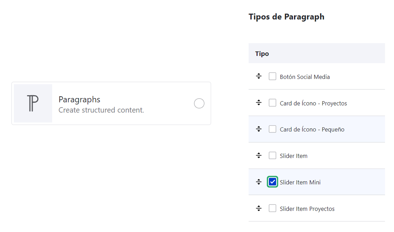 Los paragraph son elementos compuestos por campos tal como los bloques, pero que solo puede ser usados dentro de un bloque, para tener esto un poco más claro mostraremos a continuación un cuadro comparativo entre un Bloque y un Paragraph